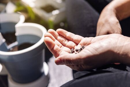 close up of a hand with seeds to plant it in flower pots at the balcony, hobbies at home, sustainable and ecological lifestyle concept