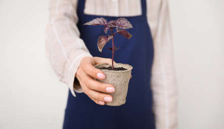 Woman holding plant seedling in peat pot on light background