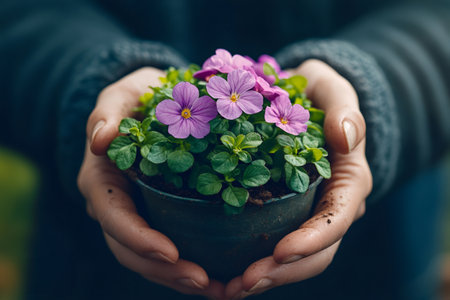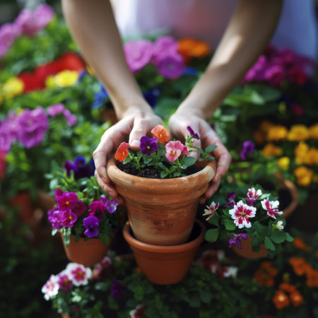 Hands hold gently a pot of blooming flowers amidst a colorful garden