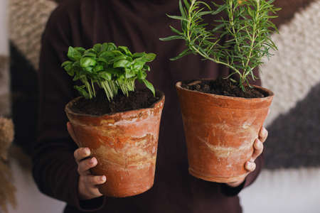 Fresh green basil plant and rosemary plant in clay pots in woman hands on background of rustic room. Close up. Repotting and cultivating aromatic herbs at home. Horticulture