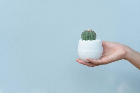 woman gardener hands holding cactus in the greenhouse garden