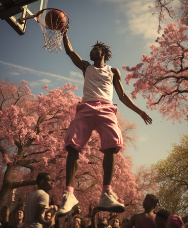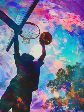 A spirited young woman leaps high into the air, basketball in hand, ready to slam dunk against a bright blue sky. The vibrant colors of the court and the sunlit trees create an exhilarating atmosphere of athleticism and joy