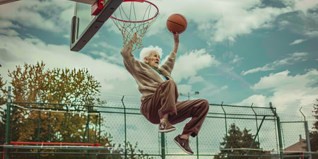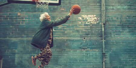 Elderly man playing basketball on a street court. Sport and active lifestyle concept.