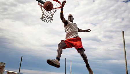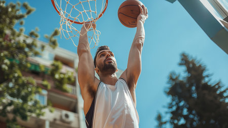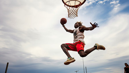Generative AI : Street basketball player making a powerful slam dunk on the court Athletic male training outdoor on a cloudy sky background Sport and competition concept