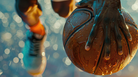 Generative AI, Basketball player is holding basketball ball on a court, close up photo
