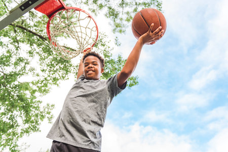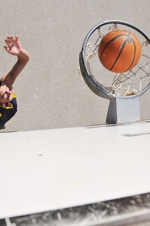 Young boy making a slam dunk in street basketball with blue sky and white clouds