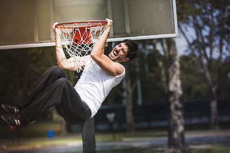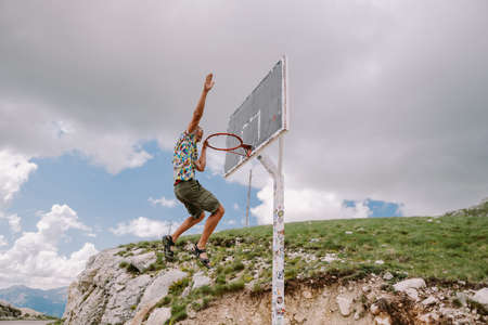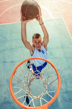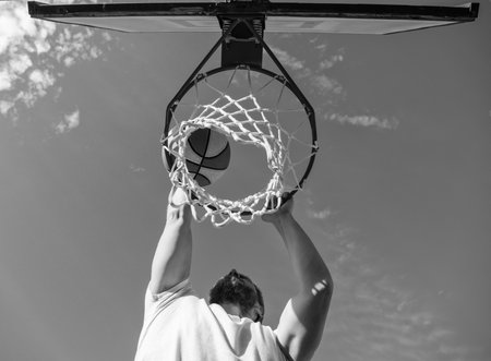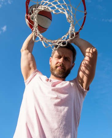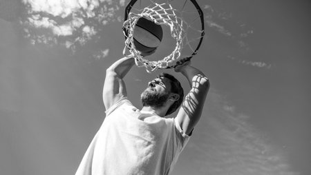 guy has sport motivation. sport and hobby. dunk in basket. slam dunk in motion.