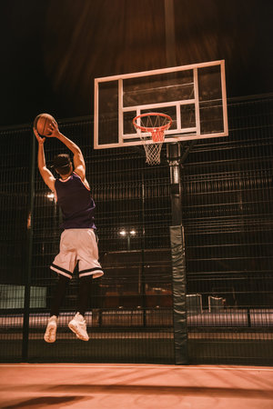 Full length portrait of stylish young basketball player in cap jumping and shooting a ball through the hoop while playing outdoors at night