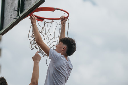 Boy hangs from basketball hoop net during outdoor game, showing teamwork and athletic energy