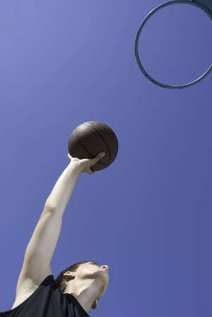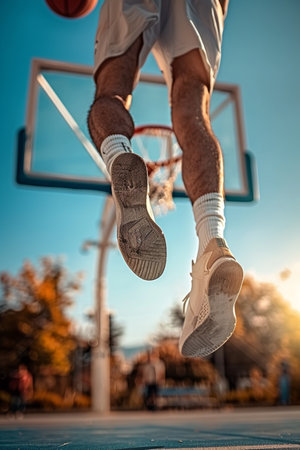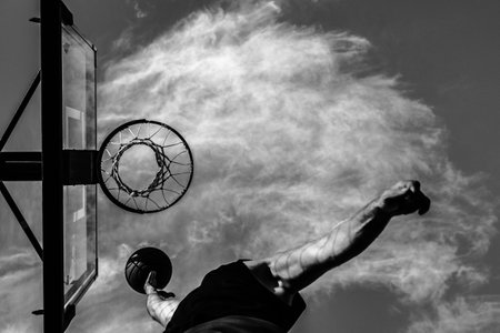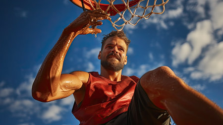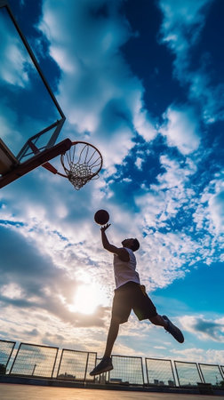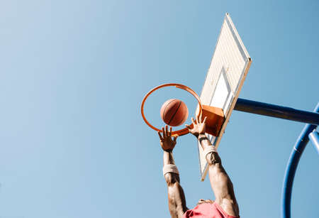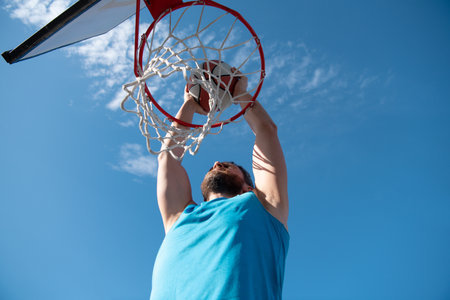 shot from below of male athlete jumping and putting the ball in a basketball hoop. The sky is seen in the background, of a sunny day.