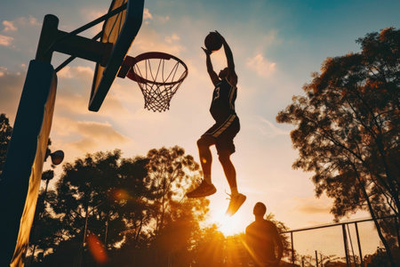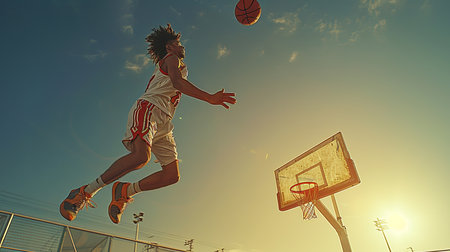 basketball player in action at sunset. 3d rendered illustration over white background.