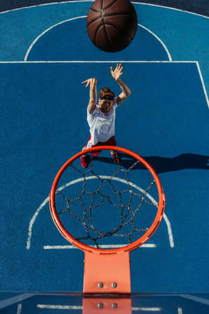 Basketball. A teenager in blue sportswear throws a ball into a basketball Hoop. Bottom view. Sky in the background. Concept of sports games.