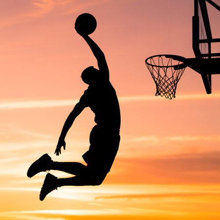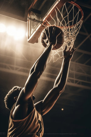 Action shot of a basketball player dunking, crowd cheering in the background, with intense focus on athleticism