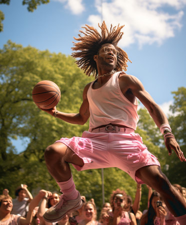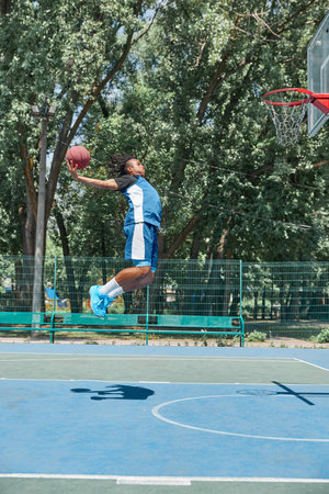 young african american basketball player athlete in action jumping on playing field on a sunny summer day