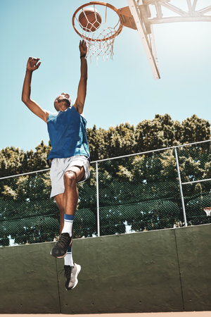 Basketball, sport and man jump dunk a ball into the net during a match on a sports court. Fit and active athlete jumping to score during a training game. Healthy athletic african man in action