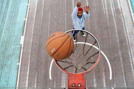 Interesting game. Top view of a nice young man playing basketball while being on the sportsground