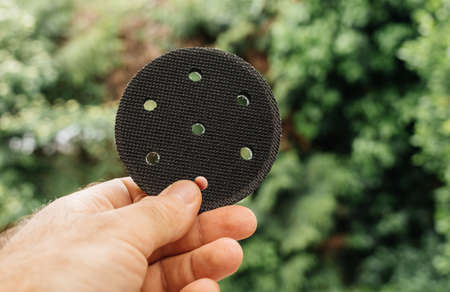 Male hand holding new interface pad for a sanding machine - isolated against green background