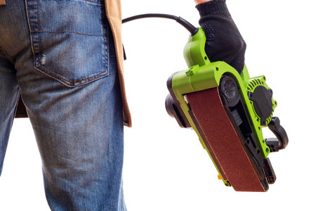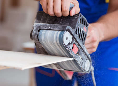 Joiner's tools. Sanding a wooden board with a hand-held electric sander