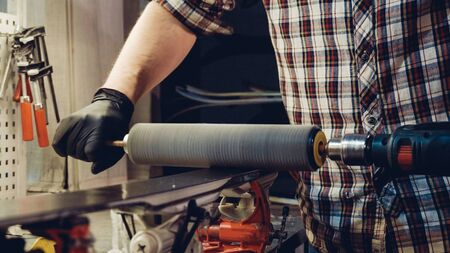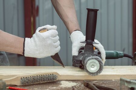 Close up of an experienced carpenter in work clothes and small buiness owner is carving a wooden board on an modern hand drill in a workshop , in the background a lot of tools
