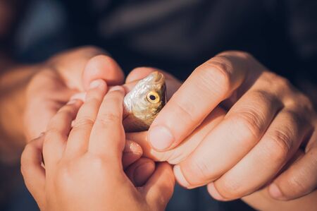 Men's and child's hands holding a rudd fish - Scardinius erythrophthalmus -caught during fishing on the pond. Father is teaching his son fishing.