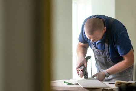 Professional tiler cutting tile with angle grinder. Construction, renovation, repair apartments