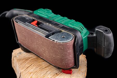 A belt sander for wood. Accessories for small carpentry work. Dark background.