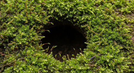 A detailed close-up of vibrant green moss forming a natural circle around a dark, empty hole.
