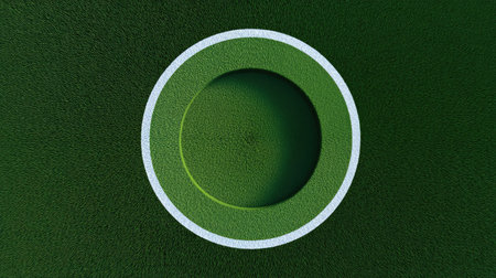 This aerial view features a vibrant circular green field surrounded by a white border, showcasing a textured grass surface ideal for sports and recreational activities.