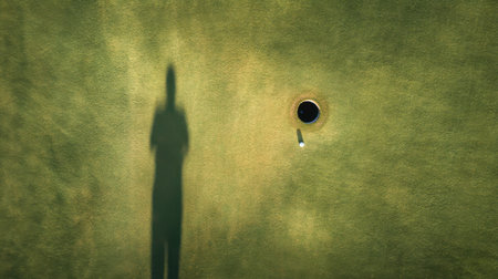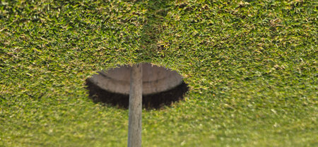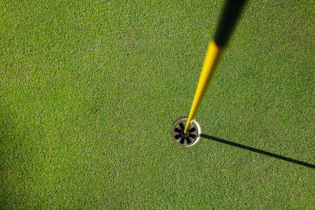 Close up of a golf course putting green hole with flag pole in afternoon light with shadow