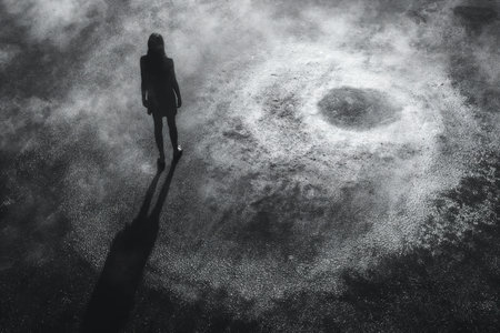 A detailed view of an abstract shape, featuring a rough, organic texture and a bright, warm light source at its core, creating a striking contrast with the surrounding darkness.
