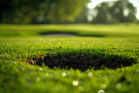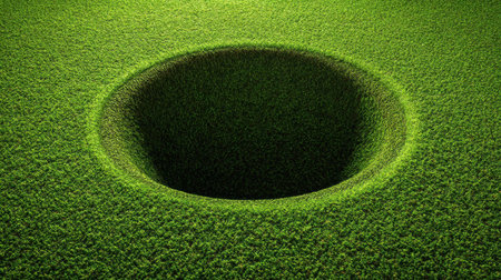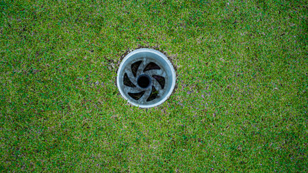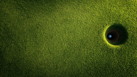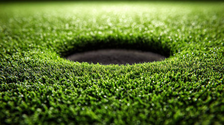 This image features a close-up view of a golf hole nestled in vibrant green grass, showcasing texture and detail in a sunny outdoor setting ideal for sports themes.
