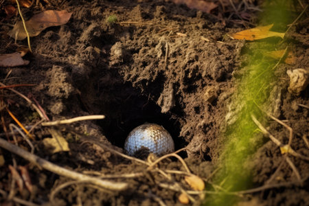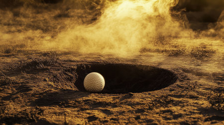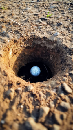 Generative AI Super slow motion of golf ball falls into the hole at the camera, view inside the hole close-up.