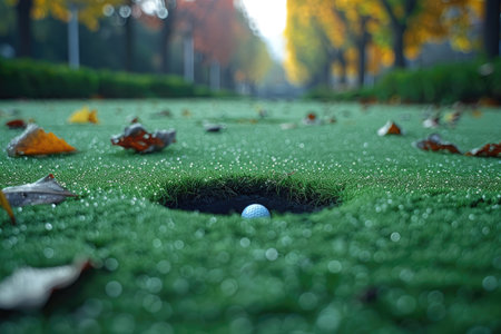 A golf ball is positioned near the edge of the hole, reflecting an attempt to score. The scene is captured on a verdant green with a putter present. The close-up view suggests an outdoor setting during the day. This image could be used in various contexts, including sports publications or promotional materials.