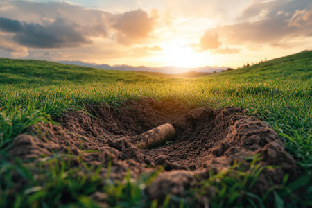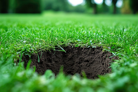 A freshly dug hole in a vibrant green lawn, with sunlight highlighting the surrounding grass and creating a natural setting. High quality photo