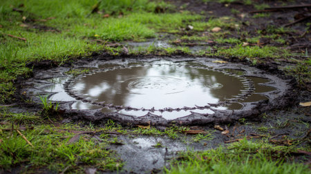 This image captures a serene circular puddle reflecting the sky, framed by rich green grass and textured muddy soil, showcasing natural beauty and calmness.