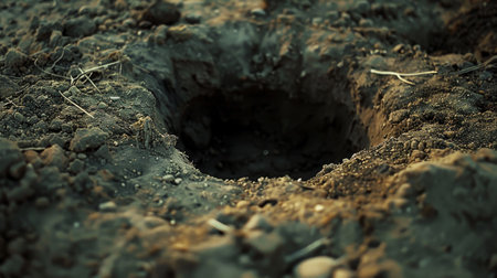 Round hole in the ground, surrounded by loose dirt