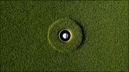 This stunning aerial shot captures a golf ball nestled in a hole on a well-manicured putting green, surrounded by vibrant, lush grass, showcasing the beauty of the sport.