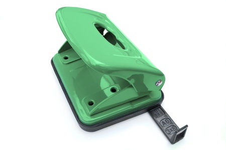 A red hole punch and a red stapler on a green background. Minimal stationery concept.