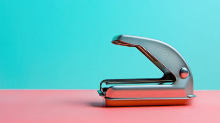 This image features a modern metal stapler resting on a vibrant pink and blue background, showcasing a blend of creativity and utility for any workspace.
