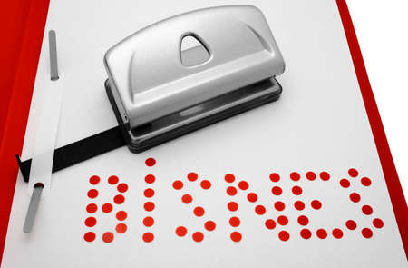 Business is still life. Opened folder for papers, a clean sheet is a word «business», made from the red confettis of done hole punch.