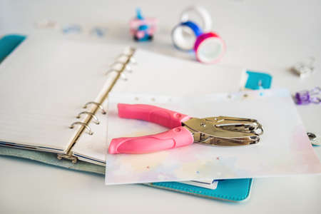 Notepad and stationery on white background. Planner for business and study. Fans of stationery