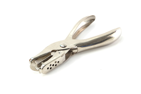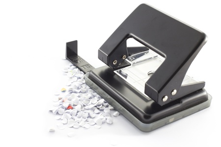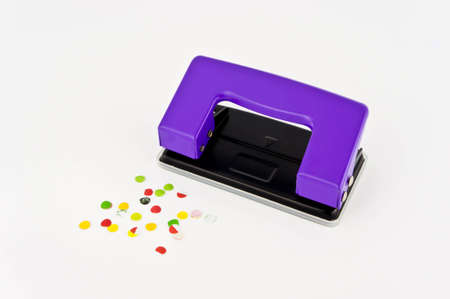 Hole puncher leaves a trail of colored circles, isolated on white.