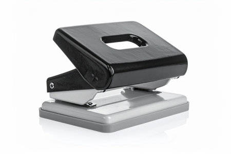 A black stapler sits elegantly against a soft, muted background, embodying minimalist design. This image captures the essence of office essentials, ideal for themes related to productivity and organization.