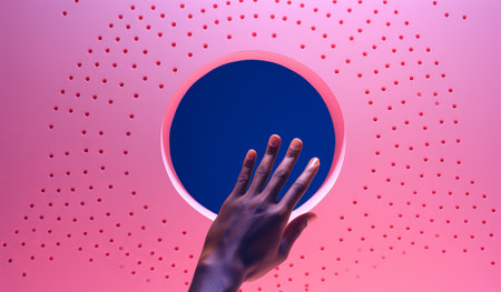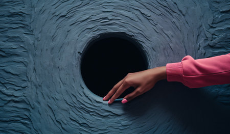 person putting a hand around a pink hole, in the style of minimalist composition, pink and blue, surreal pop, realist detail, handheld, by ai generative