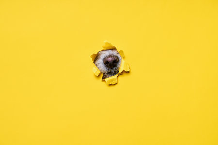 Close-up of dog nose sticking out of torn yellow paper.
