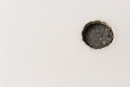A round hole in a white surface with a dark ground inside. Space for text