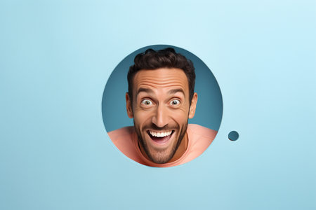 A man smiles against a pastel background with holes in advertising style