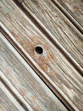 Texture of a wooden plank fence with diagonal wood strips and a hole in the center, gray brown wooden wall texture backdrop