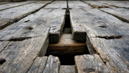 A close-up, top-down view of aged, gray wooden deck boards showing natural texture and fasteners