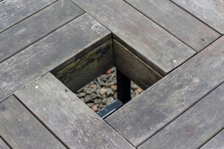 Table with stripes from an arrangement of wooden planks with a square hole in the middle.